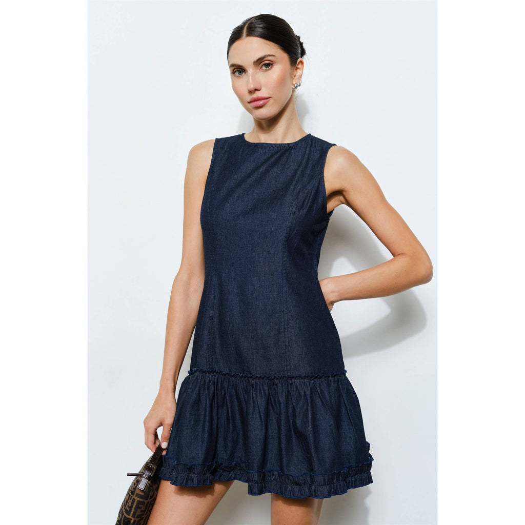 The Wren dress combines classic denim with feminine details for a fresh, updated look. Its sleeveless,crew neck design is perfectly balanced by a flirty, ruffled hem. An exposed back zipper adds a final, modern touch. S: 100% Cotton