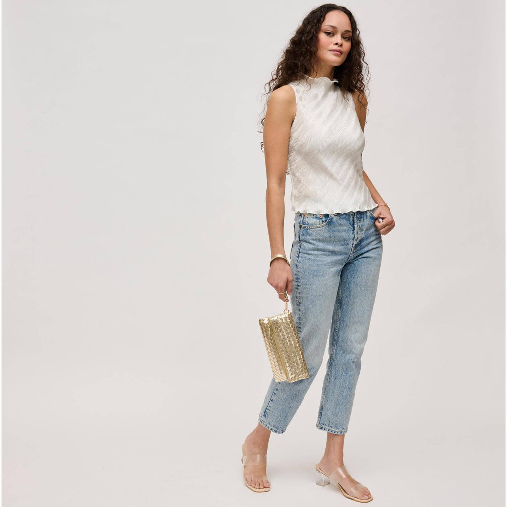 *Exterior Details: Woven Design, Foldover Flap, Detachable Wristlet Strap