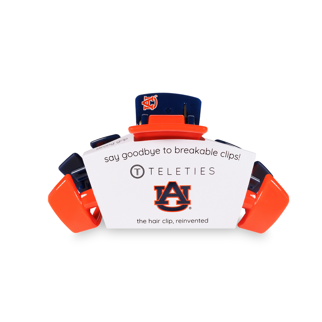 Say goodbye to breakable clips! We have perfected the hair tie and now have re-invented the clip. Each hair clip has bendable teeth that take back to shape, they work on all hair types and have a strong hold. Hold your hair and enhance your style with the new Auburn University TELETIES hair Clip! War Eagle!