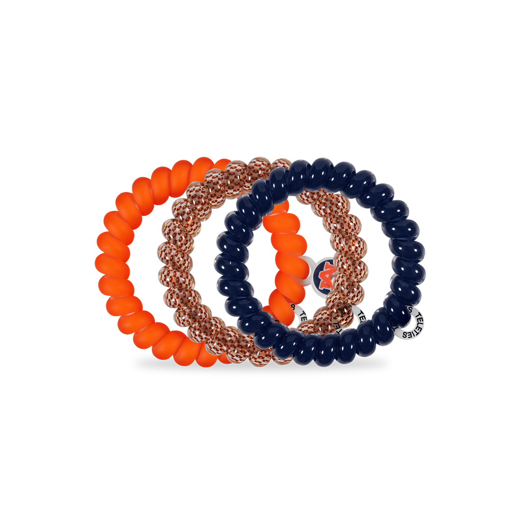 Cheer on Auburn University in style with the TELETIES, War Eagle! Large Hair Ties in Orange and Navy offer a strong grip without damage, doubling as a chic wrist accessory when not in use. Your new favorite hair essentials all year round. Shop your favorite Auburn University hair accessories now! War Eagle!