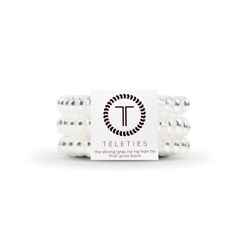 Hold your hair and enhance your style with TELETIES. The strong grip, no rip hair tie that doubles as a bracelet. Strong, pretty and stylish, TELETIES are designed to withstand everyday demands while taking your look to the next level. Sold in packs of three. The small size is 4.5cm wide x 0.5cm thick.