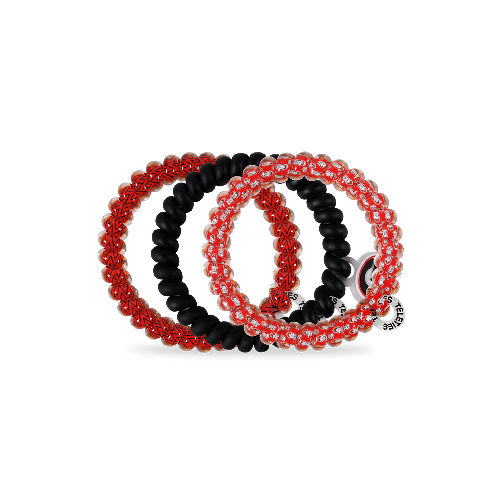 Cheer on the University of Georgia in style with the TELETIES, Go Dawgs! Small Hair Ties in Black and Red offer a strong grip without damage, doubling as a chic wrist accessory when not in use. Your new favorite hair essentials all year round. Shop your favorite University of Georgia hair accessories now! Go Dawgs!