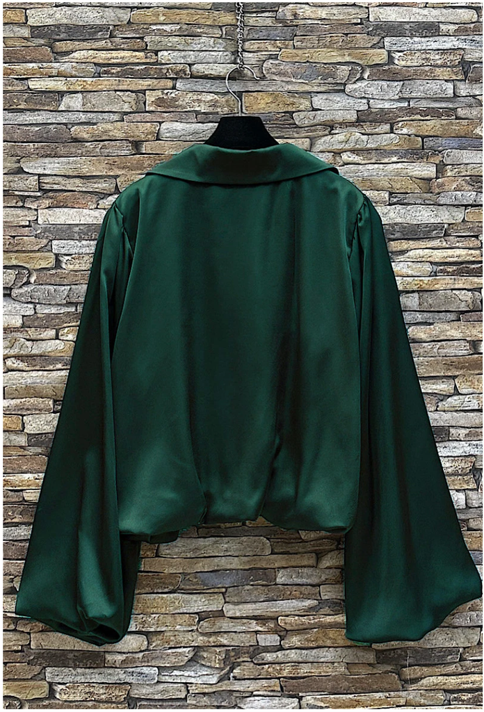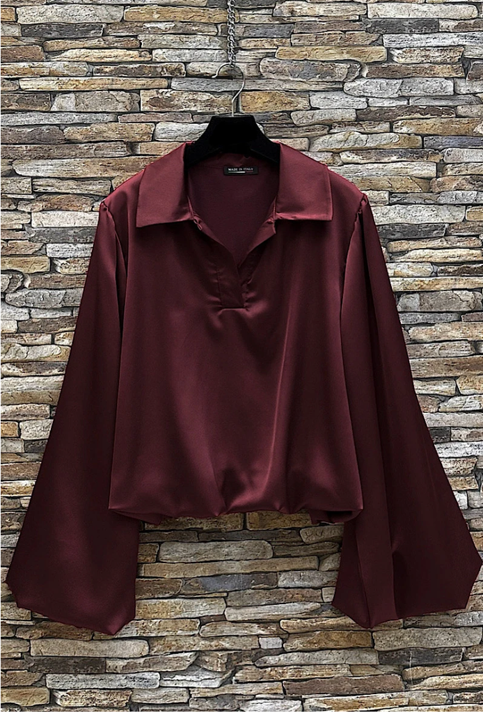 Made in Italy, this satin blouse embodies effortless sophistication. The fluid fabric drapes beautifully, catching the light with a subtle sheen. Designed with a relaxed fit, it features a soft collar, deep V neckline, and dramatic wide sleeves that create graceful movement. The gathered hemline adds a refined finish, making it ideal for pairing with tailored pants or skirts for an elevated evening or office look. Made in Italy One Size fits S/M Polyester (50%), Viscose (45%), Elastane (5%)
