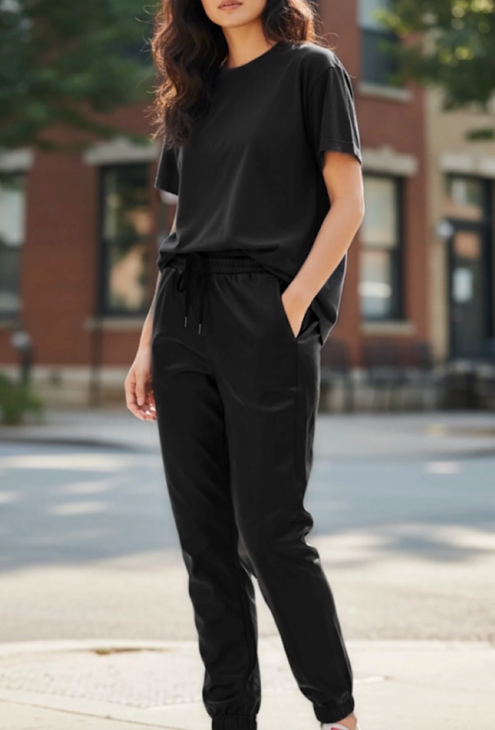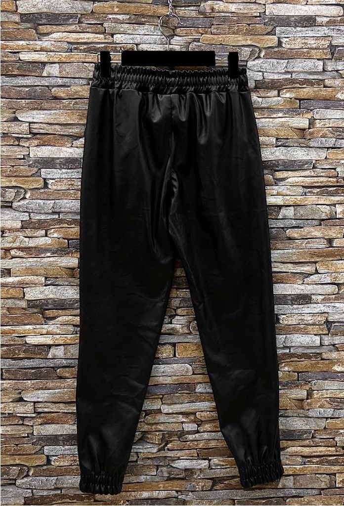 Elevate everyday styling with these sleek black vegan leather jogger pants, designed for comfort and a modern, refined edge. The smooth vegan-leather finish gives a polished look, while the elastic waistband with adjustable drawstring ensures an easy, flexible fit. Side pockets add practicality, and elastic cuffs create a clean tapered silhouette.