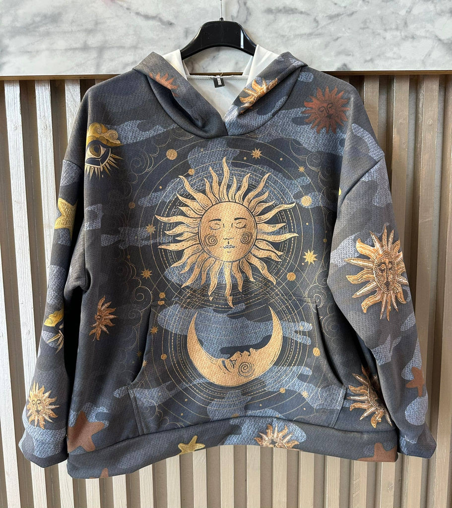 Step into a cosmic dreamscape with this mesmerizing hoodie, where a radiant sun and serene moon take center stage against a deep, star-speckled background. Golden celestial motifs orbit in perfect harmony, creating an aura of mystery and elegance. With its relaxed silhouette and captivating artwork, this piece blends streetwear comfort with an elevated, otherworldly allure One Size Made in Italy 100% Polyester
