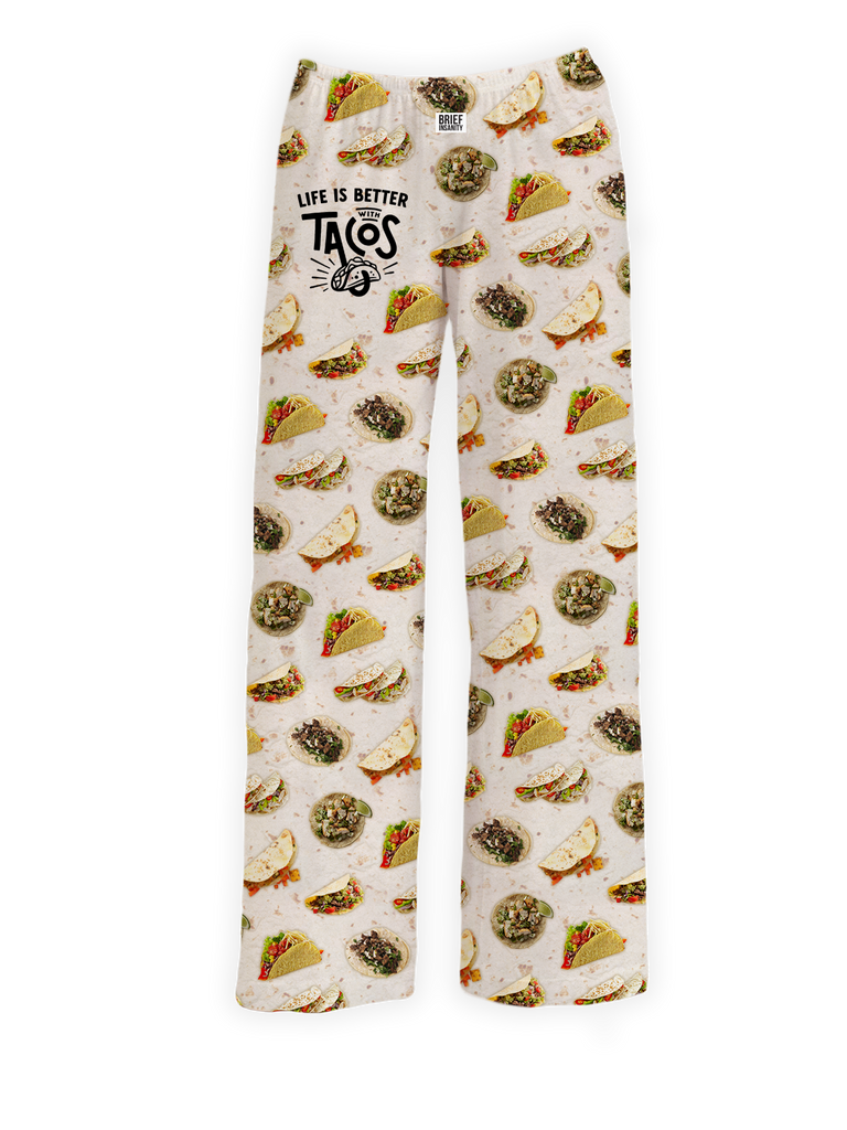 BRIEF INSANITY's Life Is Better with Tacos pajama lounge pants for 2025. Relaxation just got a lot tastier! These taco-tastic pajama lounge pants are the ultimate comfort food—without the calories. Featuring an all-over print of tacos, burritos, and all your favorite fiesta flavors, these pants are perfect for taco Tuesday, lazy weekends, or midnight snack runs. With a soft, stretchy waistband and buttery-smooth fabric, you'll feel like you're wrapped in a warm tortilla of cozy vibes. 🌮