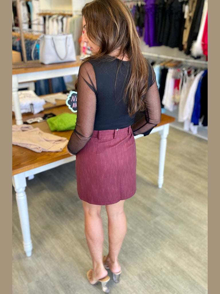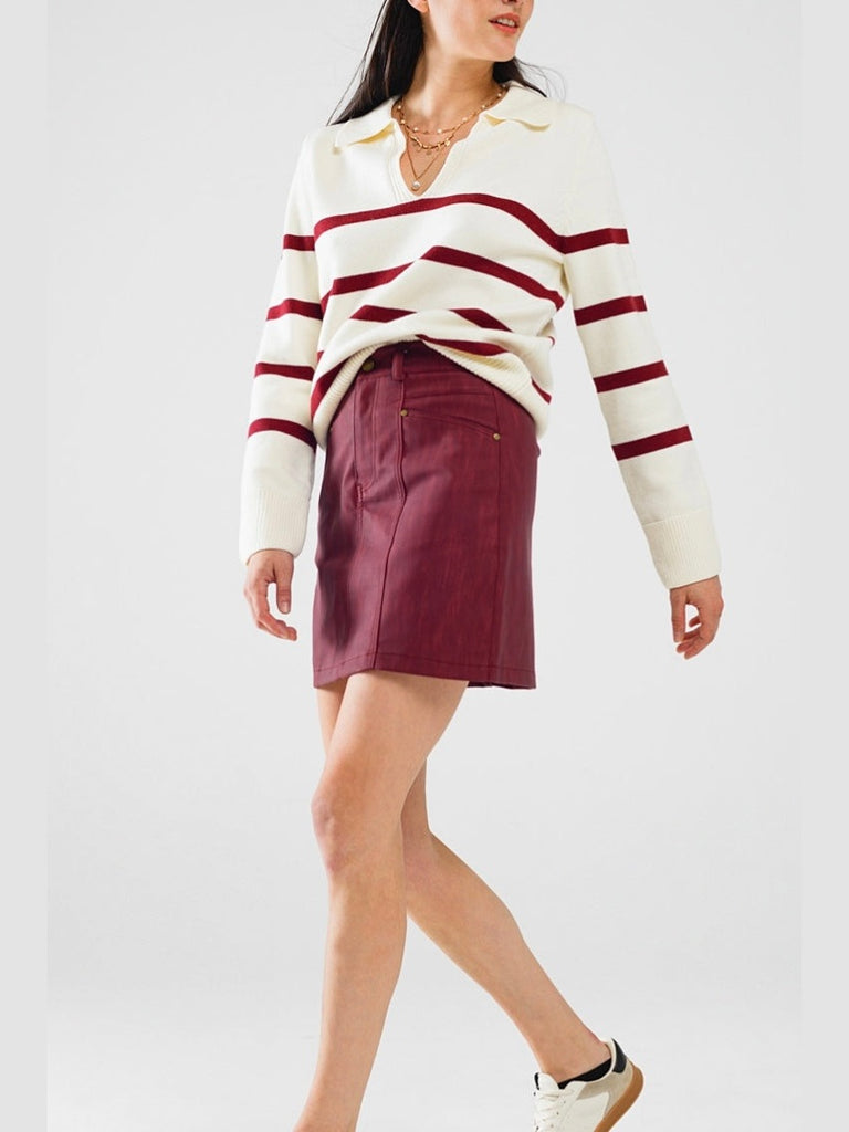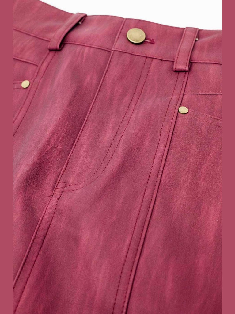 Straight mini skirt in burgundy with pockets on the front. Zip closure