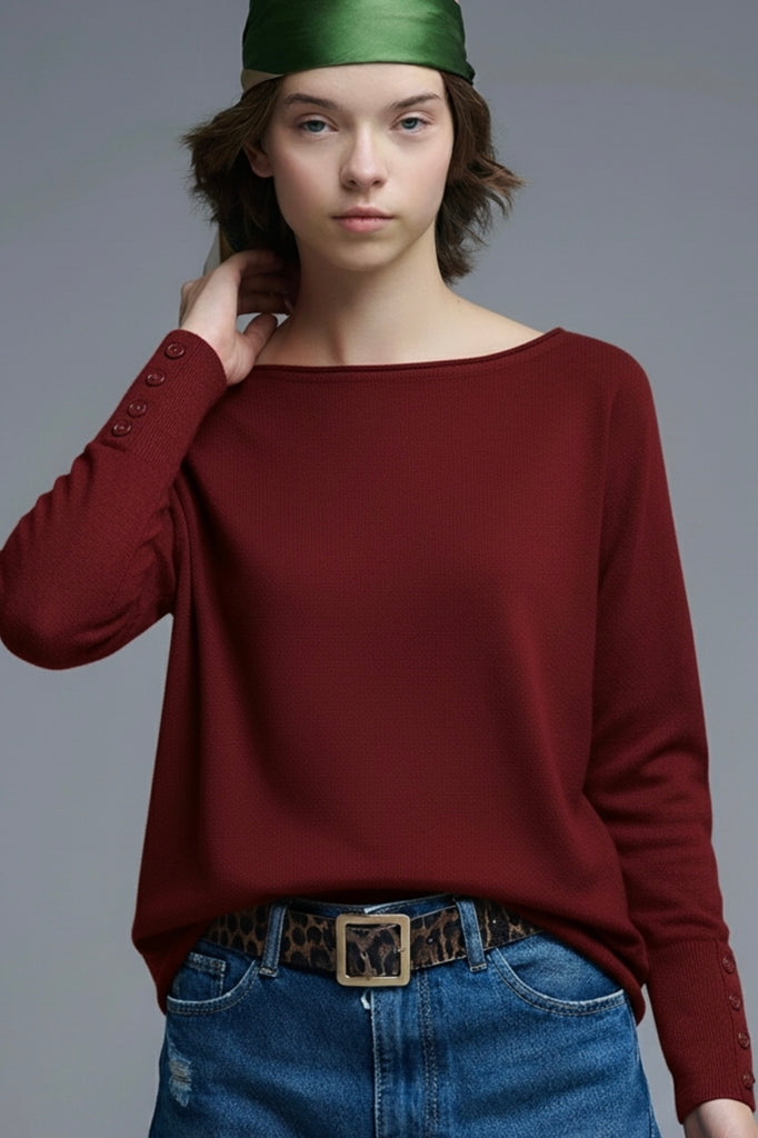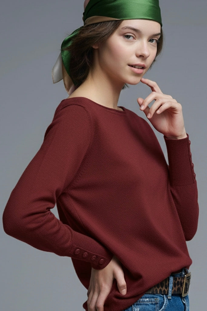 This beautifully crafted soft knit sweater offers both comfort and style. It features unique button details on the sleeves that add a touch of sophistication. The boat neck design elegantly frames the collar while the relaxed fit ensures all-day comfort making it an ideal choice for casual outings or cozy evenings at home