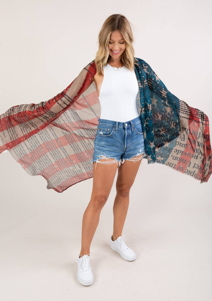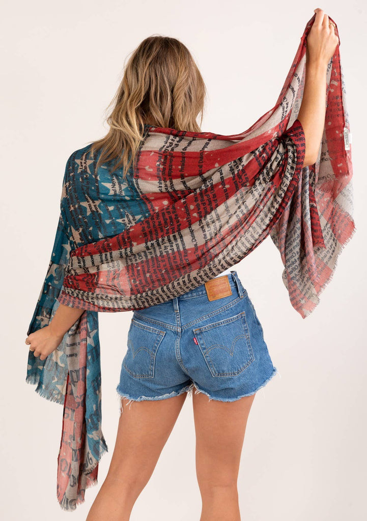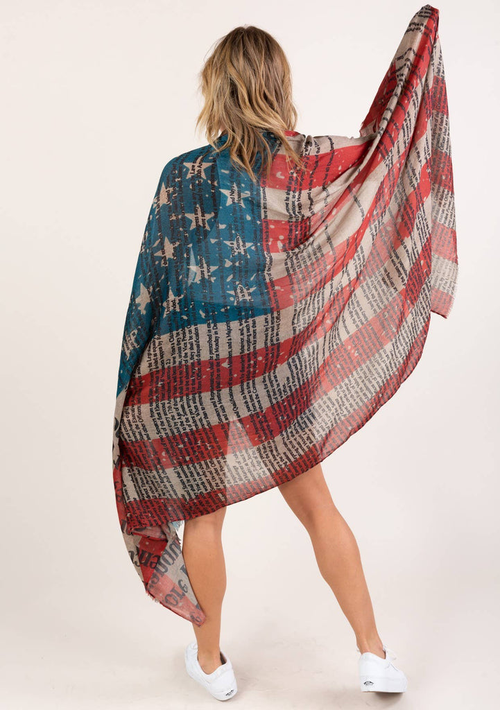 This constitution flag print scarf has a distressed look. Perfect for wearing as a scarf, shawl, face cover, or sarong!