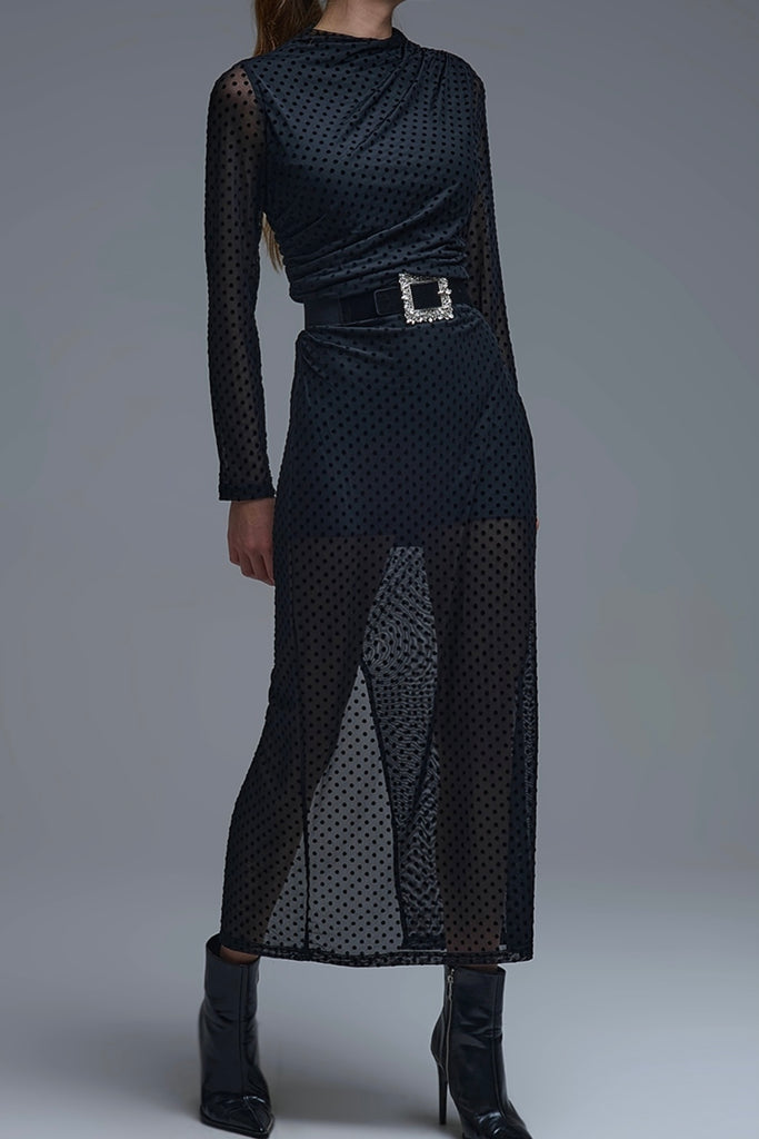 Elevate your wardrobe with our stylish black sheer mid dress! Featuring a chic polka-dot pattern this dress offers a flattering silhouette and a comfortable tailored fit. Made from lightweight fabric it’s perfect for any occasion ensuring you look effortlessly fashionable and poised.