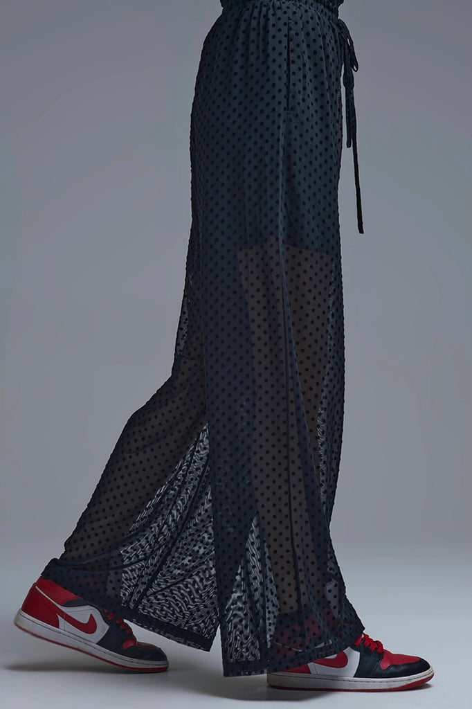 Immerse yourself in the perfect blend of style and comfort with our exquisite black sheer wide-leg pants! These eye-catching pants are adorned with a chic polka dot pattern that adds a playful yet sophisticated touch to any outfit. Designed for ultimate comfort they feature a flexible elastic waistband that adapts to your body shape along with a convenient drawstring that allows you to adjust the fit to your liking. Crafted from lightweight breathable fabric these floor-length pants flow elegantly as you move making them an ideal choice for a variety of occasions—from casual outings to more formal events. You will love the way they effortlessly elevate your look! Additionally they come equipped with practical side pockets offering functionality without compromising style. Perfect for any fashion-forward individual these wide-leg pants are a must-have addition to your wardrobe!