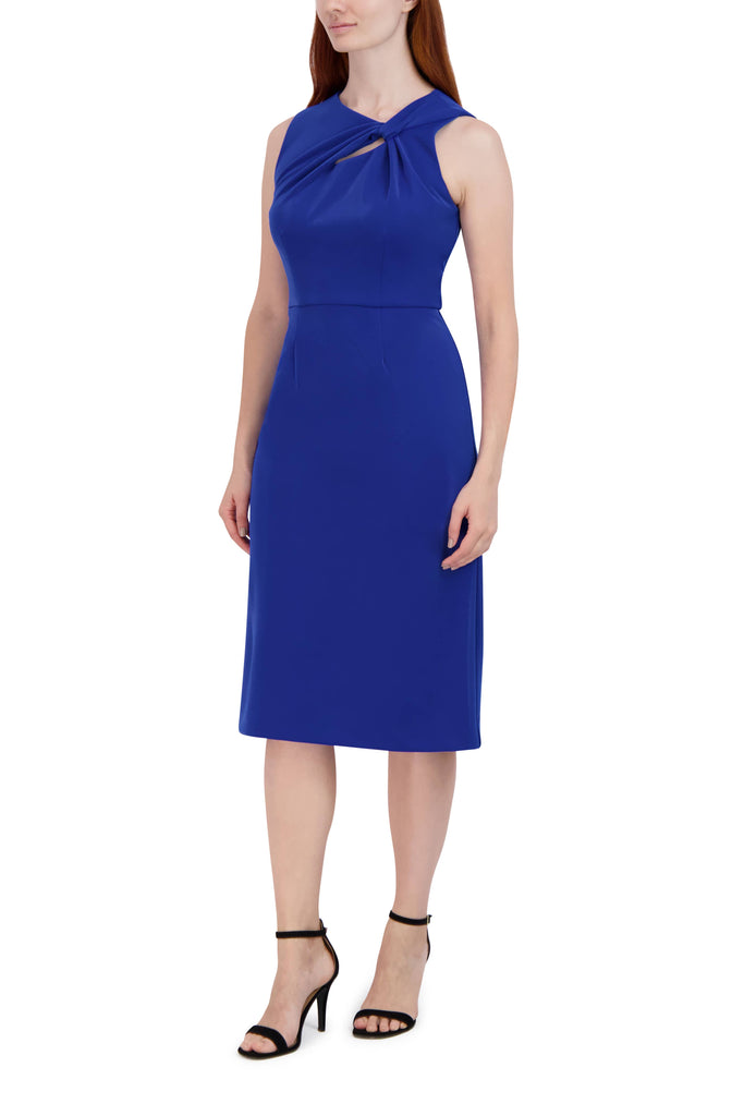 A wardrobe must-have, this beautiful sleeveless knot neck dress is made from textured knit fabric, providing a stretch-like feel. Designed with length reaching below the knee, this fitted piece is styled with a twisted side knot neckline, a cutout front display, concealed back zip closure, and a sheath silhouette.