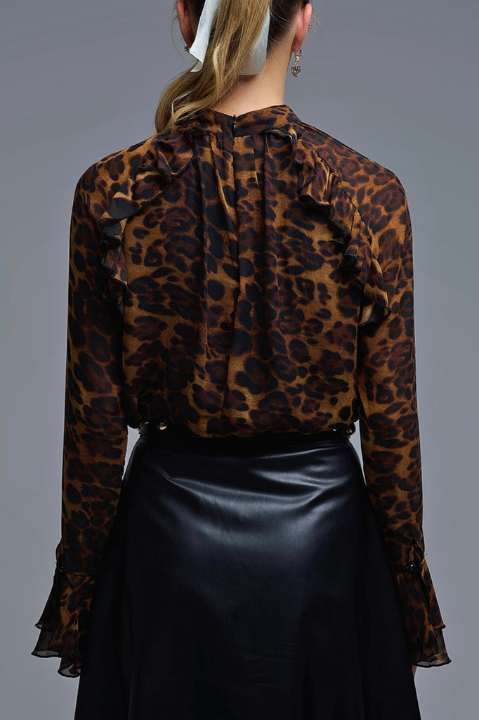 This exquisite leopard print blouse is crafted from luxurious high-quality chiffon fabric that drapes beautifully. It features intricate ruffle details along the neckline and sleeves adding a touch of playfulness to the design. The elegant high neck complements the overall silhouette making it a perfect choice for both casual outings and sophisticated occasions.