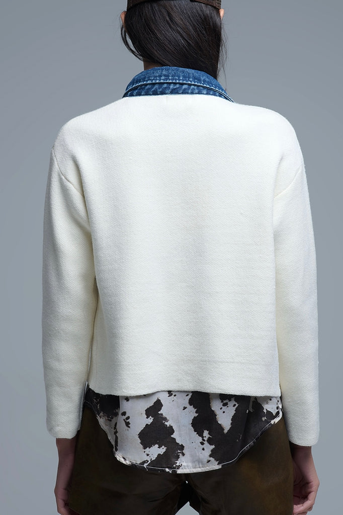 Introducing our exquisite cream knitted cardigan meticulously crafted with charming blue denim details that add a touch of modern flair. This cardigan features a stylish button placket adorned with eye-catching blue denim snap pressure buttons ensuring both functionality and aesthetic appeal. It boasts two practical chest pockets perfect for keeping essentials close at hand and a sophisticated polo collar that enhances its versatile design. This cardigan not only offers warmth and comfort but also serves as a fashionable layering piece that can effortlessly elevate any outfit—whether you're dressing up for a casual outing or cozying up at home. Make this unique and stylish cardigan a staple in your wardrobe today!