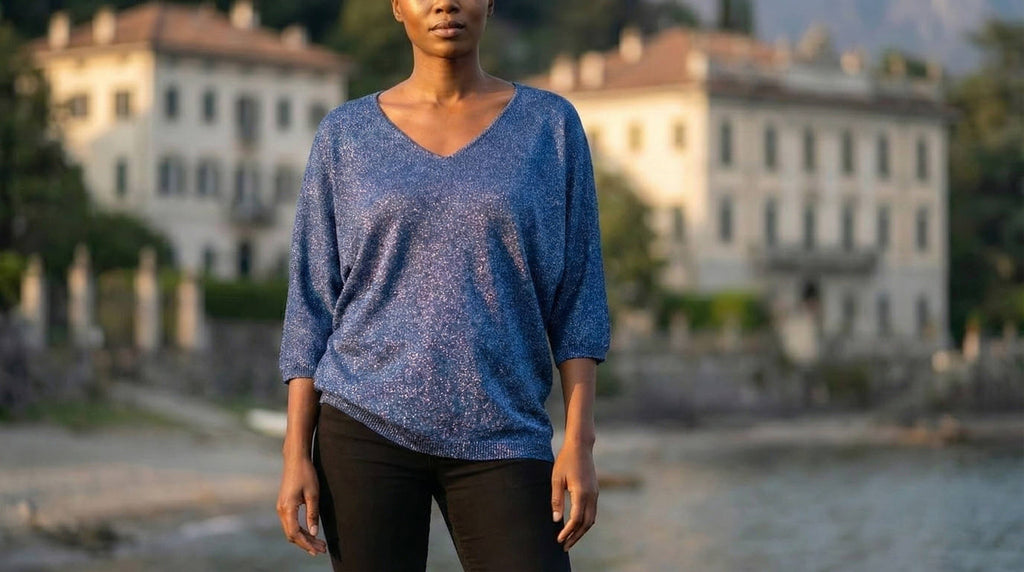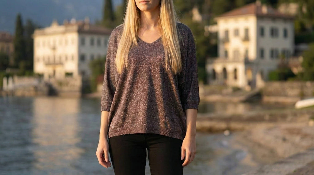 A refined essential with a soft metallic glow, this shiny lurex knit sweater offers effortless elegance through its relaxed silhouette and flattering V-neckline. The beige tone delivers a versatile, timeless look enhanced by a subtle shimmer that catches the light beautifully. Designed with comfortable 3/4 sleeves and crafted in a lightweight knit, it pairs seamlessly with trousers, denim, or skirts for elevated everyday style.