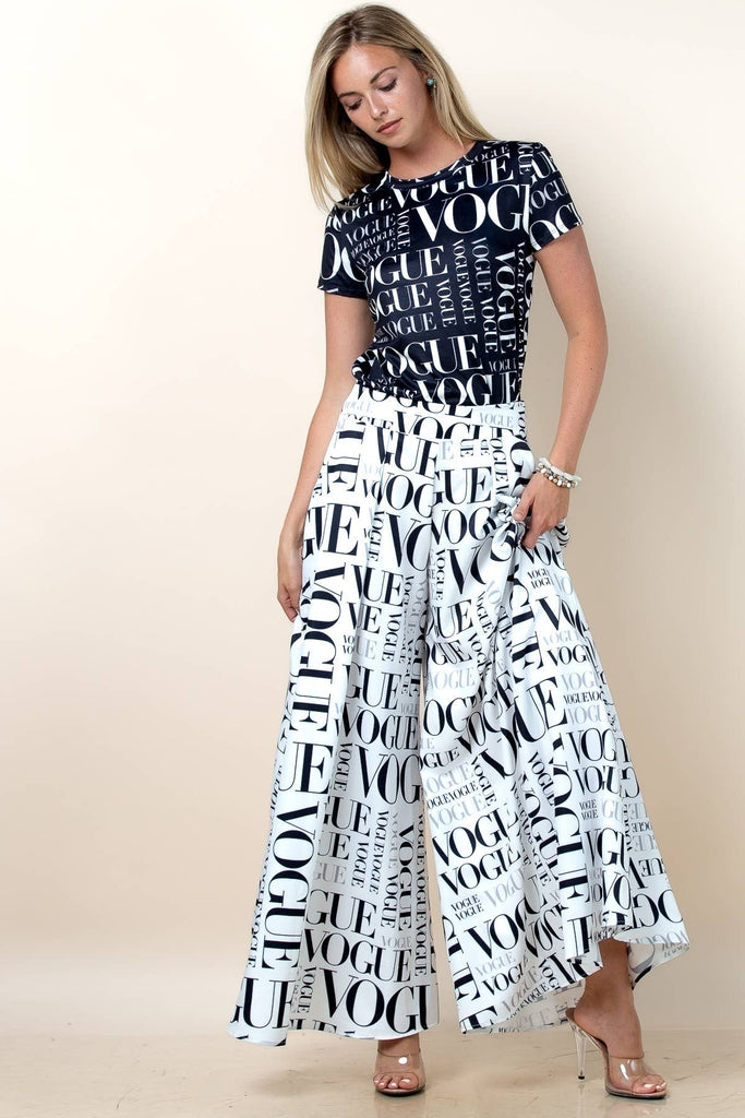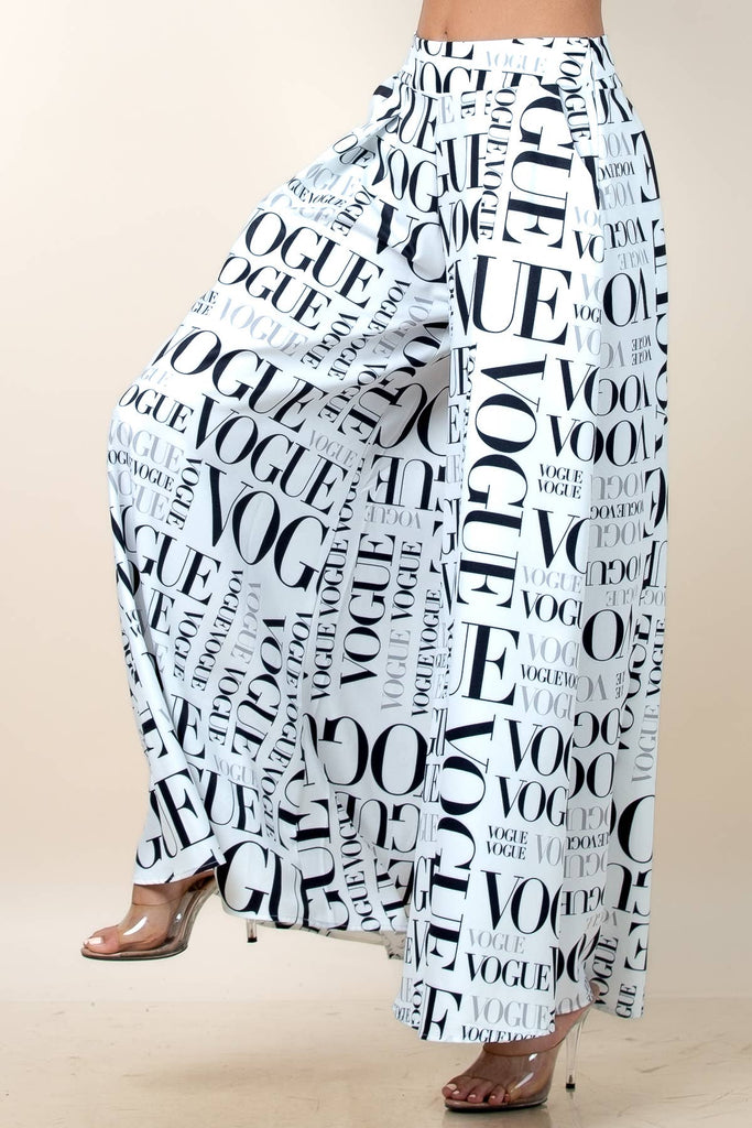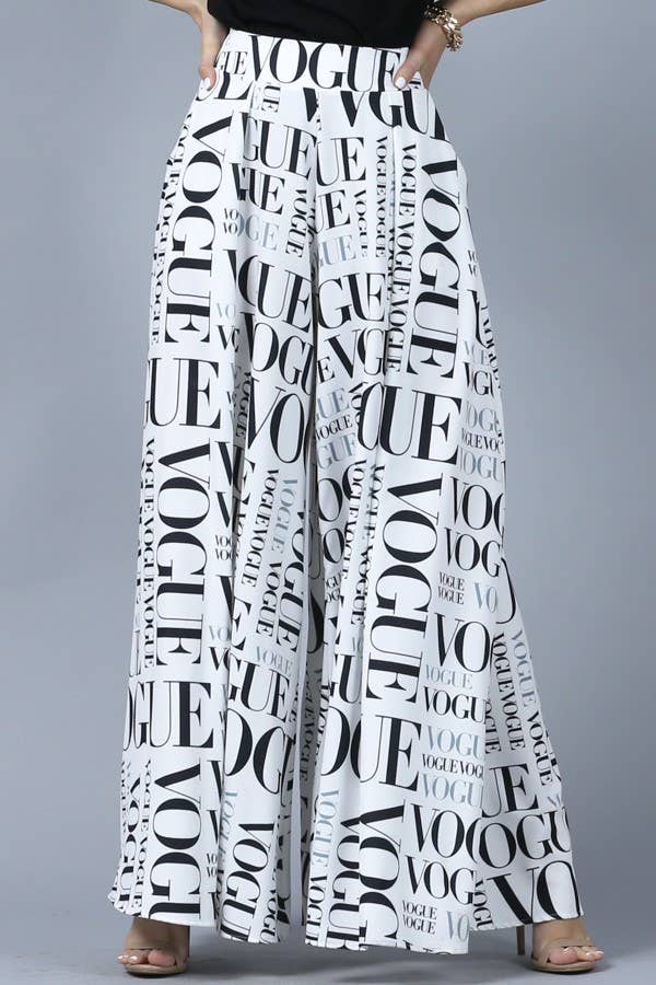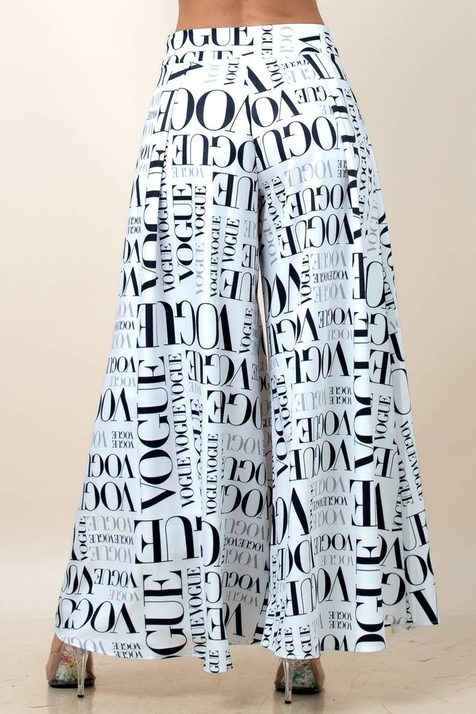 -Vogue White Prints Pants -Wide Leg Palazzo Pants -Zipper, Pockets -Party, Formal Occasion -Can Be Wear T1598-5355 -Inseam 31" -Made in USA -Model wear S. Model: 5'10" 32-26-38