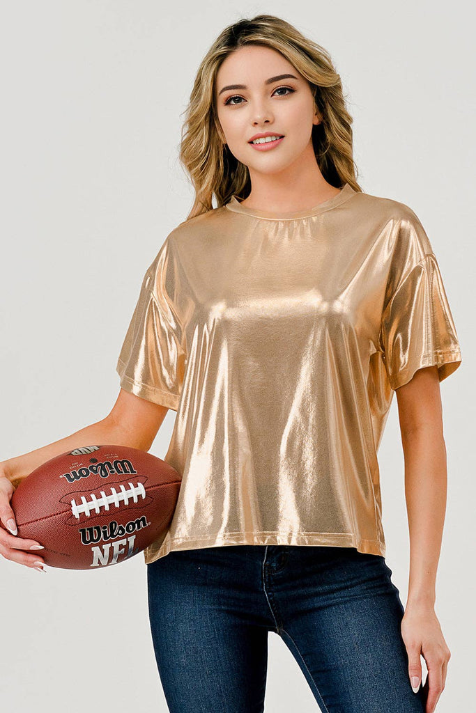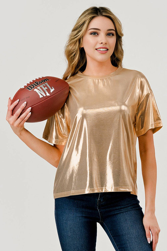 Relaxed boxy fit metallic foiled shimmer t-shirt top available in game day colors. Lightweight, stretchy fabric. Great casual, or dressed up. Fun for layering. Imported.