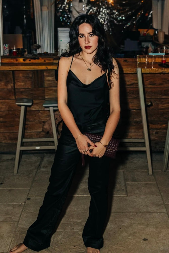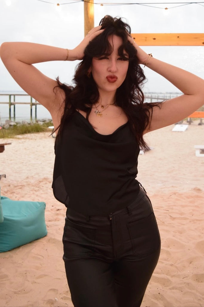 Made in USA Silky Stretch Satin Solid Backless Tie Top. Model is wearing size S