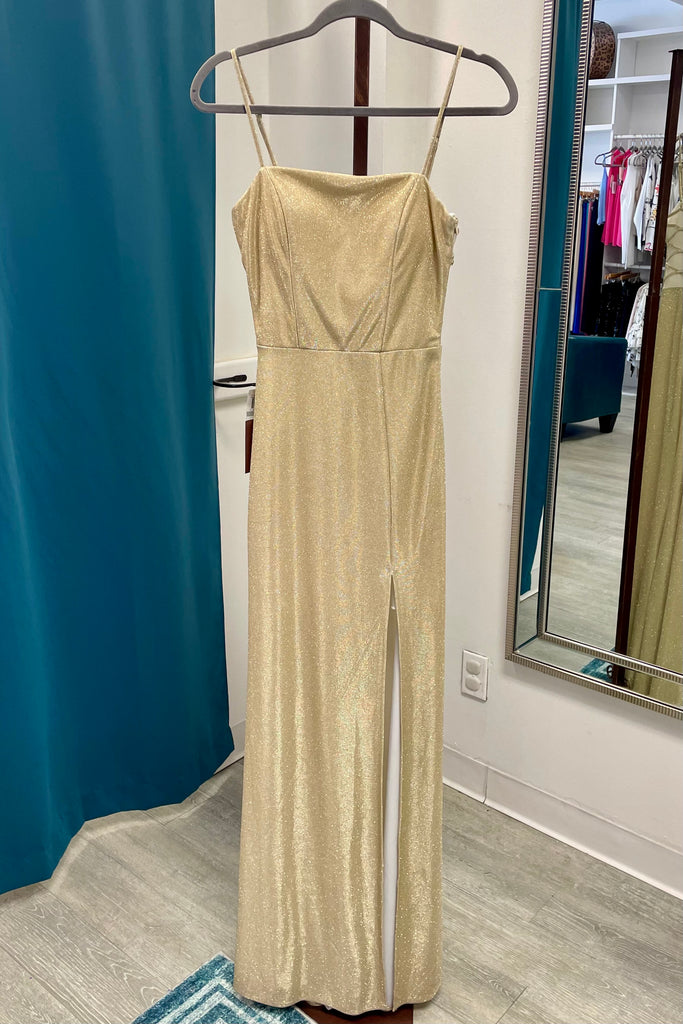 B Darlin Glitter Spaghetti Strap Mesh Back Gown - Gold