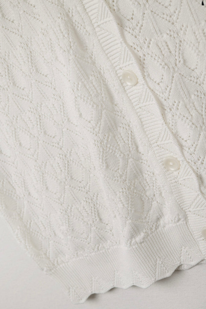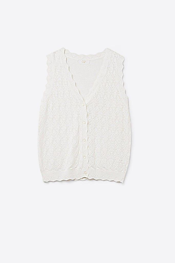 Introducing our elegant White Pointelle Knitted Vest a perfect blend of comfort and style. This sleeveless vest features scalloped edges along the V-neckline and armholes adding a feminine touch. Crafted from lightweight pointelle knit it offers breathability making it ideal for layering. The classic button-down front allows for versatile styling—wear it open for a relaxed look or buttoned up for a polished appearance. Elevate your wardrobe with this charming and sophisticated piece!