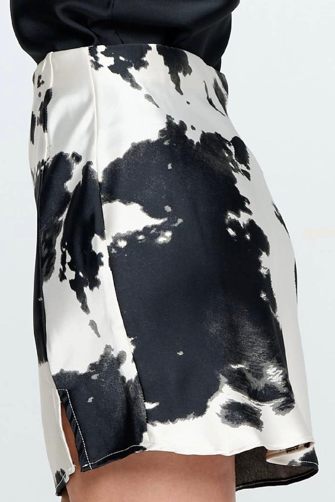Made in USA Cow Print Satin Mini Skirt with Slit. Available in other Colors. Fabric content: 97% Polyester, 3% Spandex. *SIZE & FIT* Raquelle is wearing a Small Height: 5'9 Waist: 26 Bust: 34C