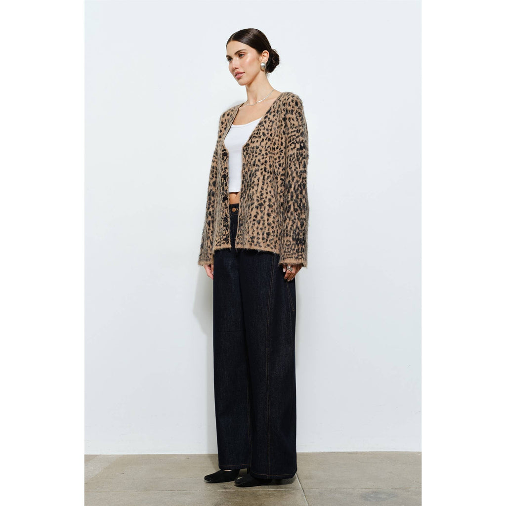 The Roxanne Cardigan makes a bold statement with its classic leopard print and sumptuously fuzzy texture. Designed with an open front and a relaxed, oversized fit, it's the perfect cozy layer to elevate any look this season. S: 68% Acrylic, 28% Polyester, 4% Spandex